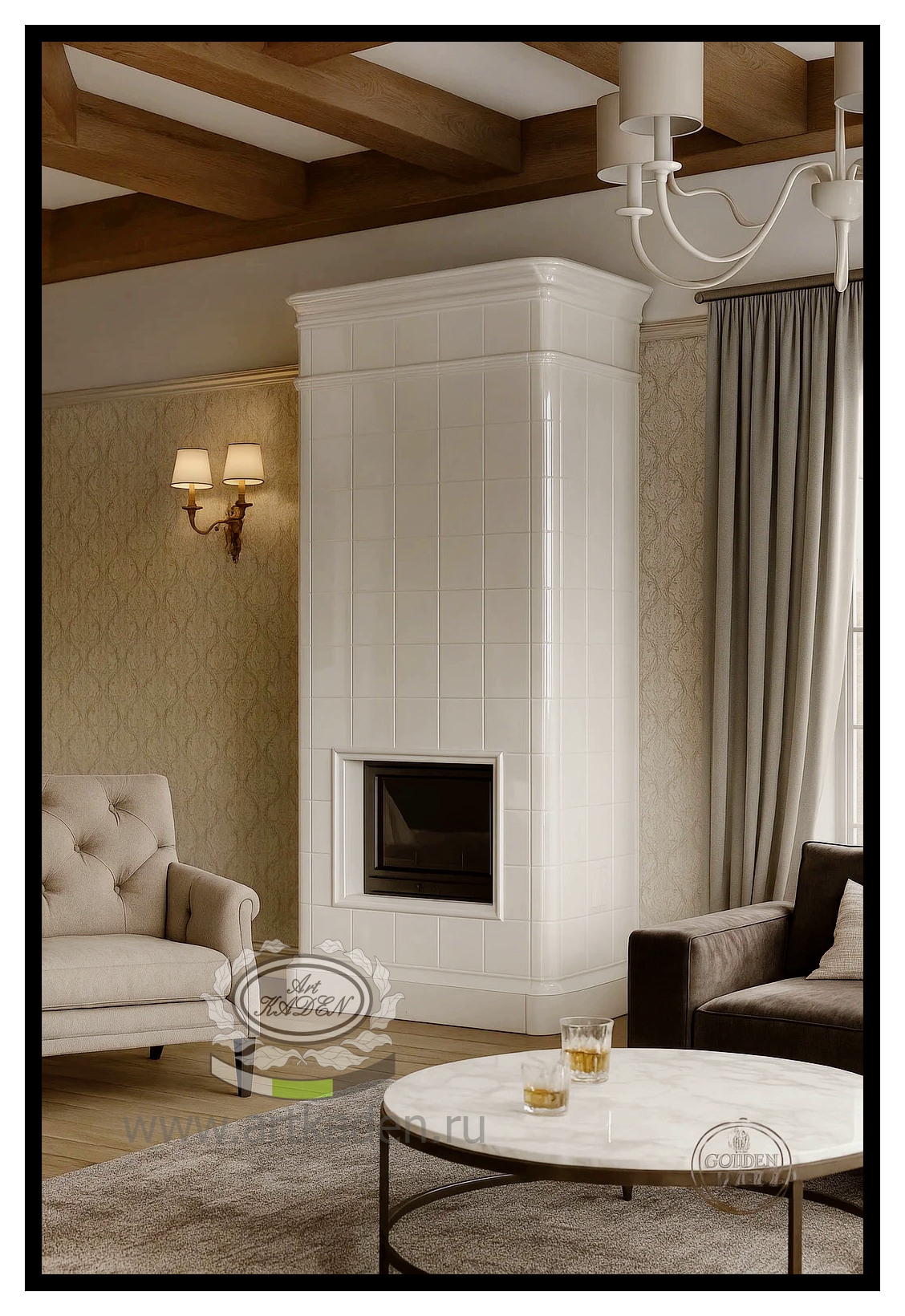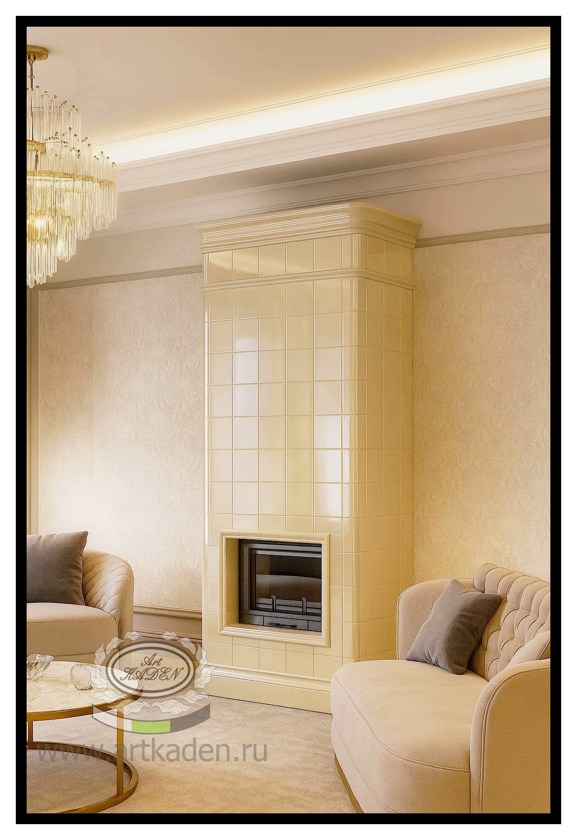 Исполнение: Изразцовая облицовка на пристенный камин "Арнем". Используется изразец серии Фоновые".