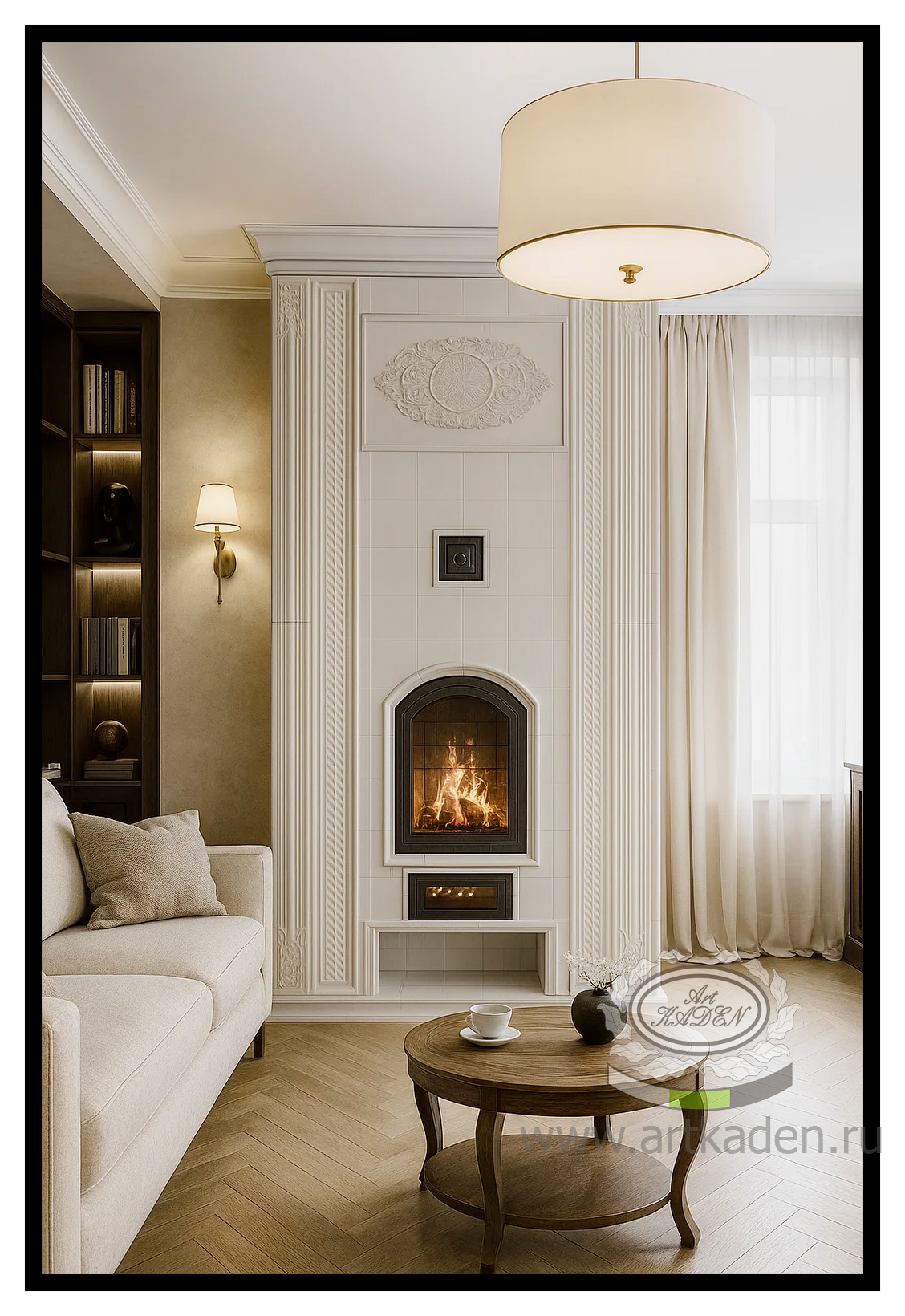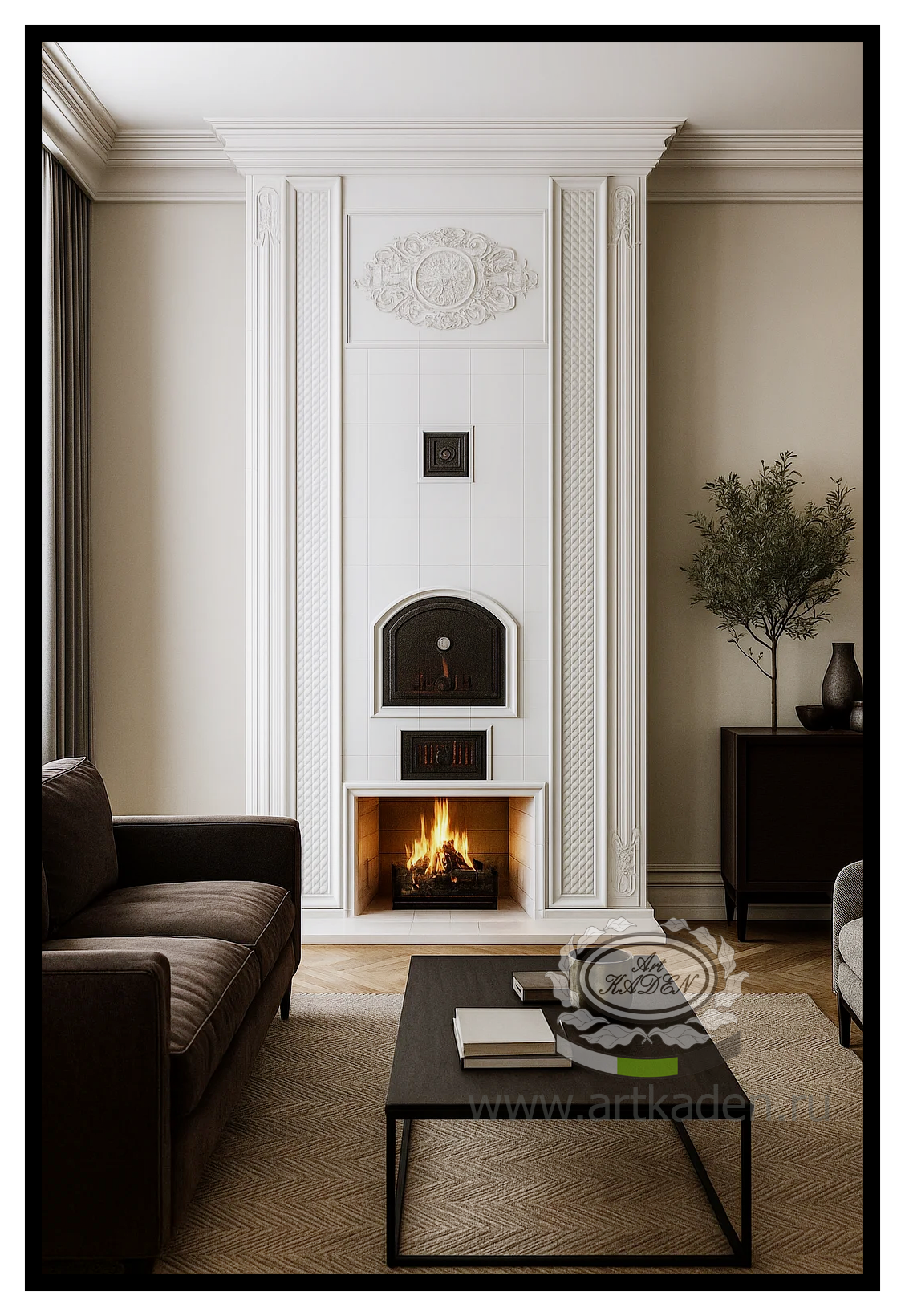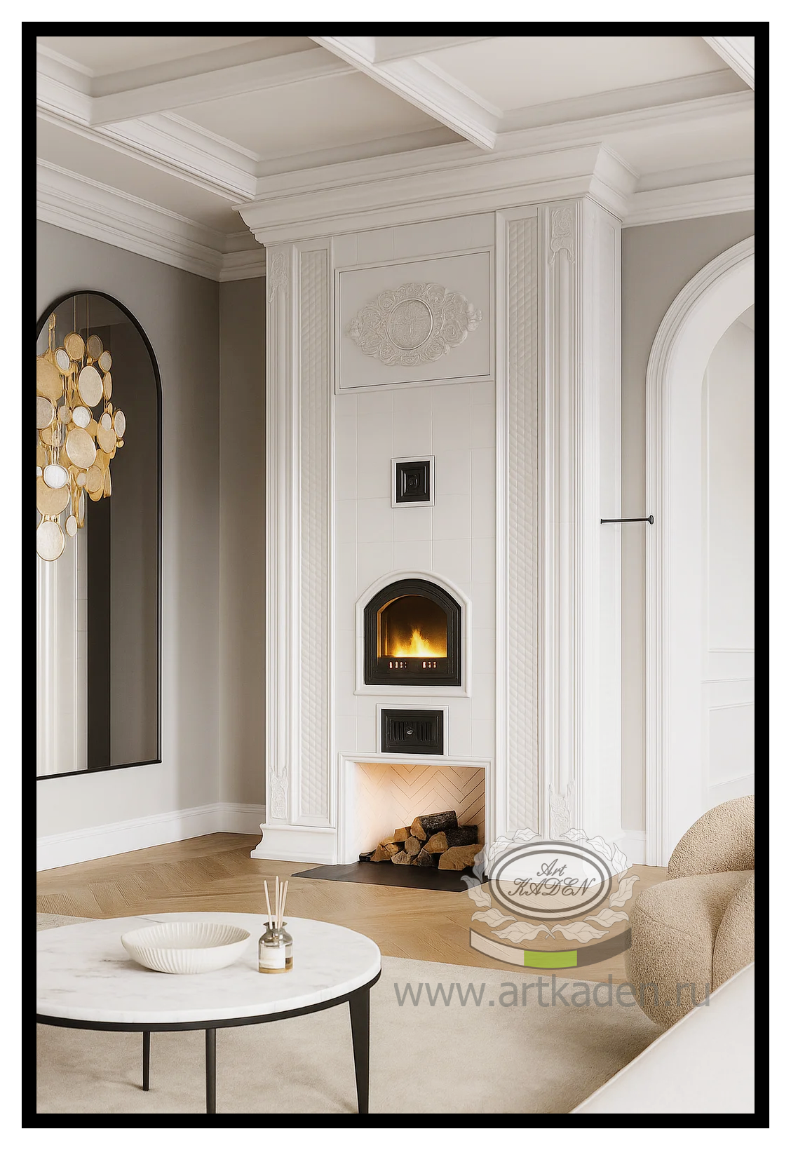 Исполнение: Изразцовая облицовка на пристенный камин "Орада". Используется изразец серии "Пирамидки".